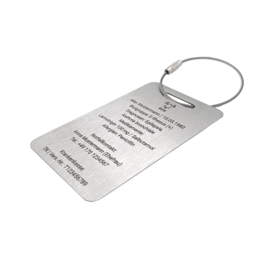 Edelstahl Notfall-Info-Anhänger im Kartenformat – Notfalldaten lasergraviert