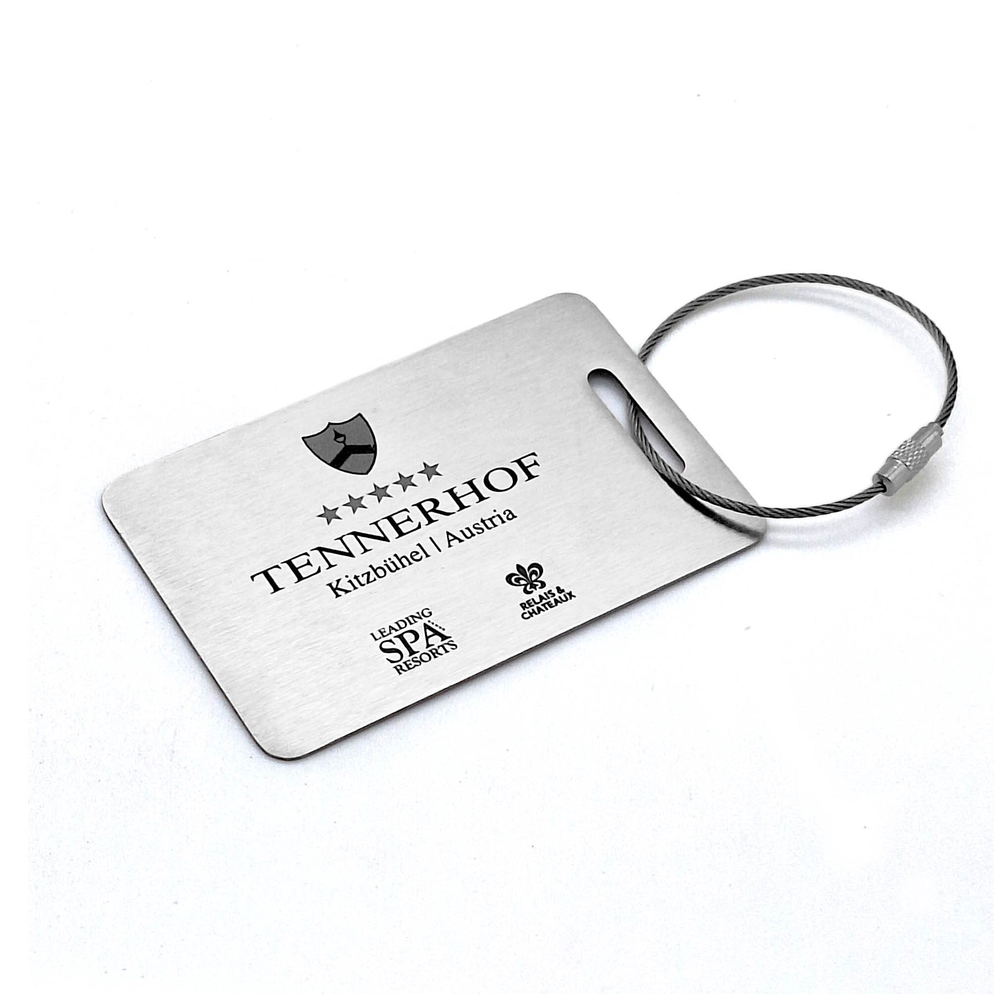 Give your luggage a touch of elegance and security with our stainless steel luggage tag. In a practical card format (85x55 mm), this tag is both compact and stylish. The individual, permanent laser engraving allows you to permanently immortalize your name, address or a personal message on the tag - for easy identification of your luggage.
