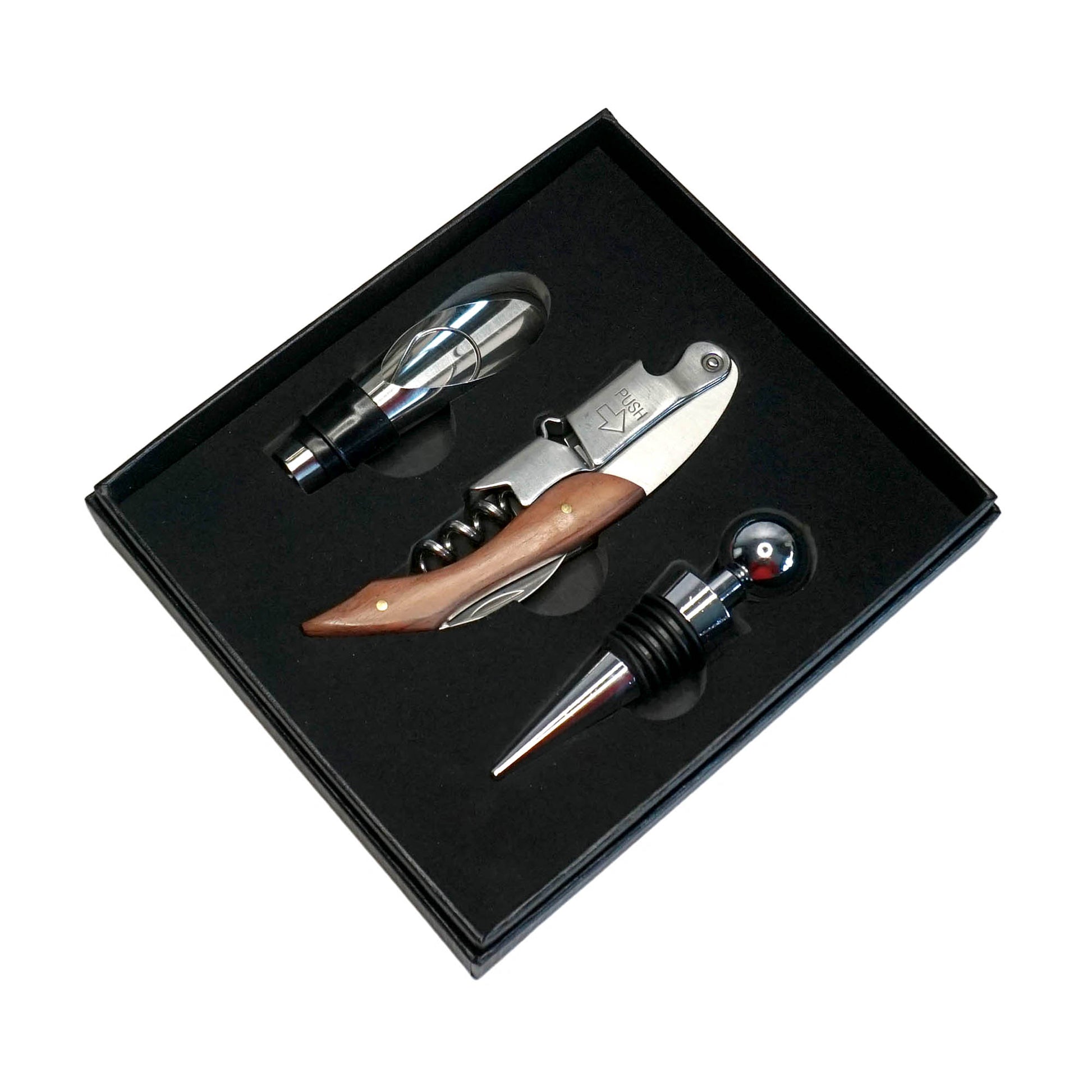 Dieses edle Wein-Set ist das perfekte Geschenk für Genießer. Es umfasst ein hochwertiges Kellnermesser mit integriertem Folienschneider und Kronkorkenöffner, einen Flaschenverschluss sowie einen praktischen Ausgießer. Die präzise Lasergravur auf dem Kellnermesser verleiht dem Set eine persönliche Note und macht es zu einem einzigartigen Präsent. Ob für Geburtstage, Jubiläen oder als besondere Aufmerksamkeit – dieses Wein-Set beeindruckt durch seine stilvolle Optik und seine vielseitige Funktionalität. (Maße der Box: 16 × 13,5 cm.)